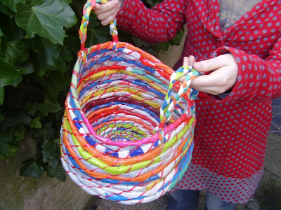 And at that neat blog I found a link to this wonderful recycling craft at The Lucky Ladybird where she teaches you how to weave unwanted plastic shopping bags into baskets. She says they’re sturdy, flexible and waterproof. They’re also really great looking! She says she plans to use hers for a laundry basket but these would be wonderful for holding recycling, toys and so much more.