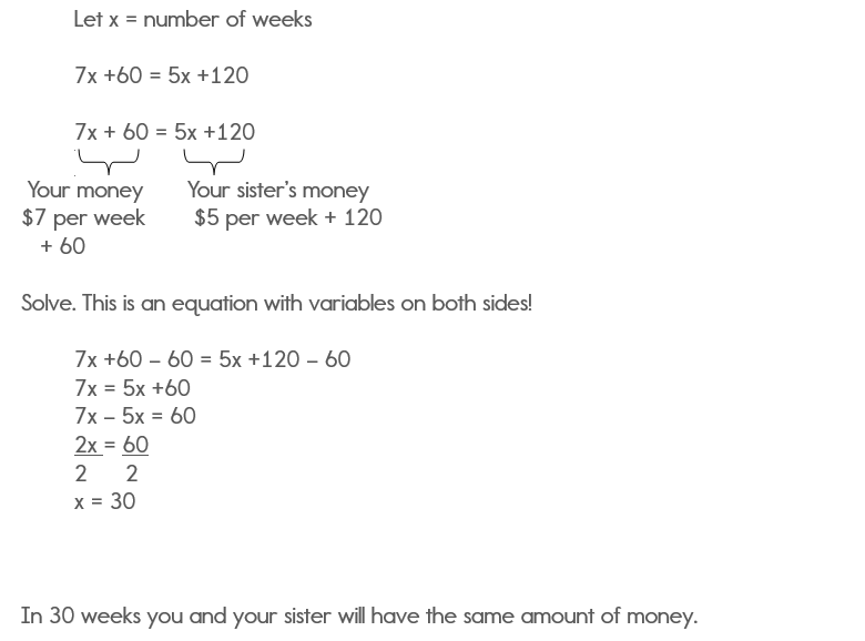 You have $60 and your sister has $120. You are saving $7 per week and your sister is saving $5 per week. How long will it be before you and your sister have the same amount of money?