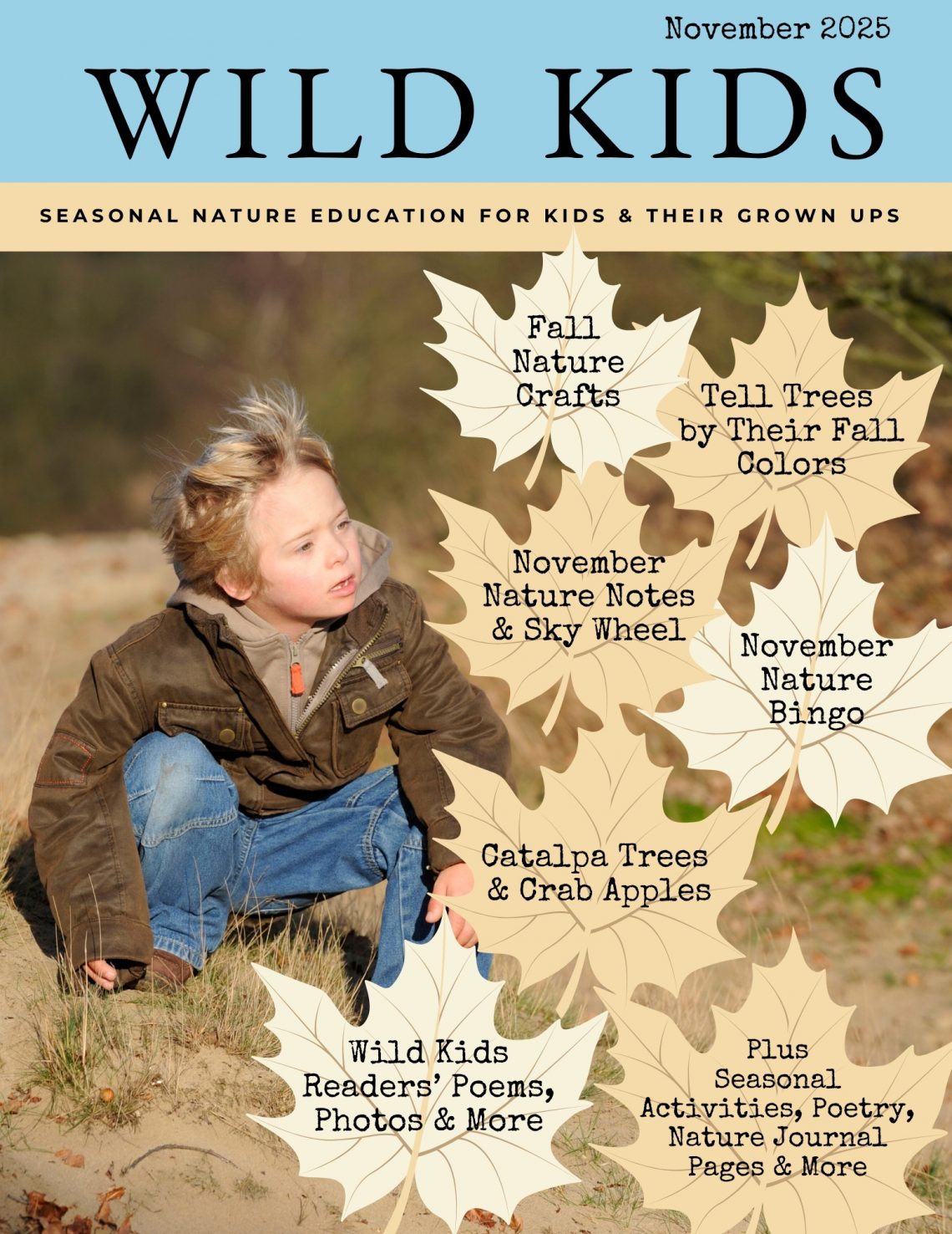 Happy November! Here is the November 2025 issue of Wild Kids Magazine. In this month’s issue, we have information on which fall colors go with which trees, a November nature Bingo, some fun fall crafts to try, information about Catalpa and crab apple trees, a November sky wheel and photo challenge, ways to learn and play with nature this month, poems and photos from a Wild Kids family, and all of the usual nature study pages, a weather tree and more. This month’s issue is 22 pages. As always, it’s in PDF form so you can read it online, send it to your Kindle, or print it out. And as…